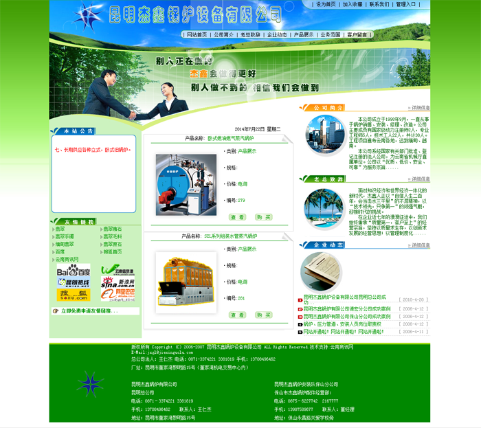 目前,公司主要是美國(guó)FULTON燃油(蒸汽、熱水)鍋爐、電(蒸汽、熱水)鍋爐、澳大利亞南方集團(tuán)熱水器公司電熱水器、成都豪特容積電熱水爐、瑞典阿法拉伐板式換熱器、韓國(guó)慶東熱水鍋爐、韓國(guó)泰宇(蒸汽、熱水)鍋爐、韓國(guó)斯大鍋爐、德國(guó)WILO水泵、江蘇風(fēng)神空調(diào)集團(tuán)、豪瓦特?zé)岜?、上海喬治·費(fèi)歇爾系統(tǒng)有限公司及日本、德國(guó)、英國(guó)等國(guó)內(nèi)外一流的鍋爐供暖設(shè)備在云南的總代理。業(yè)務(wù)涉及到勞斯萊斯發(fā)電機(jī)組、變壓器、電氣設(shè)備等其它行業(yè)。同時(shí)公司下設(shè)機(jī)電加工廠,專業(yè)生產(chǎn)熱管暖風(fēng)爐,常壓鍋爐及其它非標(biāo)設(shè)備。