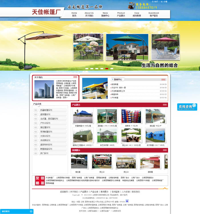 云南索樂(lè)商貿(mào)帳篷生產(chǎn)定做昆明帳篷,云南帳篷,云南昆明帳篷廠,云南昆明戶外帳篷,昆明戶外帳篷,云南昆明折疊帳篷,昆明折疊帳篷,云南昆明救災(zāi)帳篷,昆明救災(zāi)帳篷,昆明廣告帳篷,云南廣告帳篷,昆明旅游帳篷,云南旅游帳篷,昆明廣告?zhèn)?,云南廣告?zhèn)?,云南昆明遮?yáng)傘等帳篷的專業(yè)生產(chǎn)廠家;云南索樂(lè)商貿(mào)有限公司旗下的天佳帳篷廠是一家集開發(fā)設(shè)計(jì)、生產(chǎn)、銷售戶外遮陽(yáng)帳篷、活動(dòng)折疊篷、廣告帳篷、遮陽(yáng)布料的專業(yè)生產(chǎn)廠家。 經(jīng)過(guò)多年的努力開拓、拼搏,本廠已擁有完備的生產(chǎn)設(shè)施和場(chǎng)地,有健全的組織機(jī)構(gòu)和雄厚的技術(shù)力量,有完善的生產(chǎn)管理和銷售服務(wù)系統(tǒng).產(chǎn)品銷售首先以云南為中心,逐步向全國(guó)輻射,良好的口碑使我們的帳篷很快就成為國(guó)內(nèi)外眾多知名品牌、企事業(yè)單位宣傳、促銷、廣告、慶典、休閑活動(dòng)必備器材的首選!廣泛應(yīng)用于展覽會(huì)、游樂(lè)園、別墅區(qū)、各類高檔賓館、餐廳、酒吧、咖啡廳、公寓,休閑度假旅游區(qū),休閑廣場(chǎng),游泳池,海濱浴場(chǎng),美食街,幼兒園,學(xué)校等戶外臨時(shí)活動(dòng)以及酒店、公寓樓的陽(yáng)臺(tái)、露臺(tái)、陽(yáng)光屋等休閑場(chǎng)所。