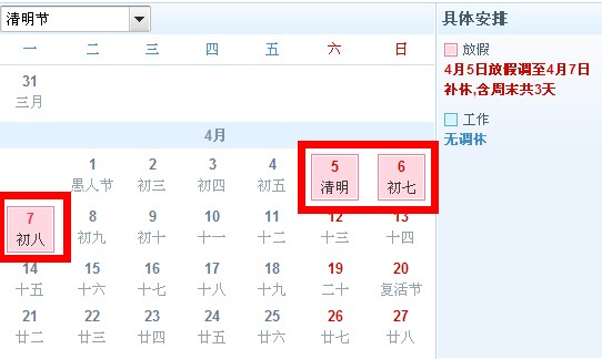 2014年4月5日至7日放假共3天。其中4月5日(星期六,農(nóng)歷清明當(dāng)日)為法定節(jié)假日,又剛好星期六公休,所能調(diào)到4月7日(星期一)補休。4月6日(星期日)公休。